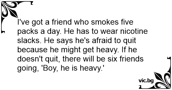 I've got a friend who smokes five packs a day. He has to wear nicotine slacks. He says he's afraid to quit because he might get heavy. If he doesn't quit, there will be six friends going, 'Boy, he is heavy.'