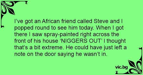 I’ve got an African friend called Steve and I popped round to see him today. When I got there I saw spray-painted right across the front of his house ‘NIGGЕRS OUT’ l thought that’s a bit extreme. He could have just left a note on the door saying he wasn’t in.