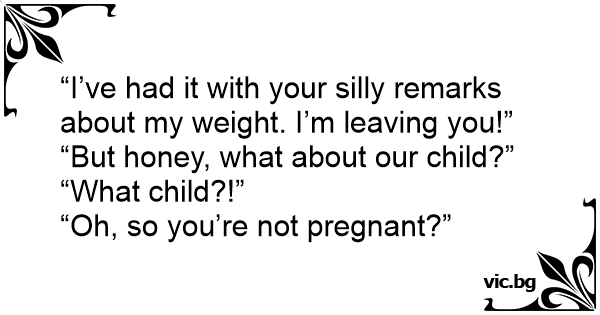 Sie: "Ich habe es satt. Ich kann deine fiesen Bemerkungen über mein Gewicht nicht mehr ertragen! Ich verlasse dich!" Er: "Aber mein Schatz, was ist mit unserem Kind?" Sie: "Was für ein Kind?" Er:...