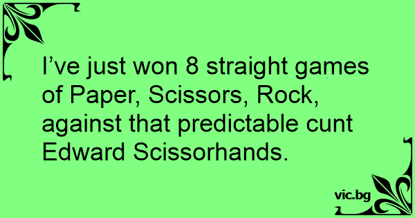 I’ve just won 8 straight games of Paper, Scissors, Rock, against that predictable сunт Edward Scissorhands.