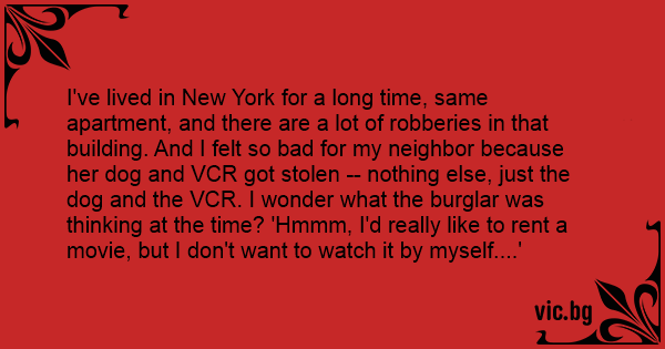 I've lived in New York for a long time, same apartment, and there are a lot of robberies in that building. And I felt so bad for my neighbor because her dog and VCR got stolen -- nothing else, just the dog and the VCR. I wonder what the burglar was thinking at the time? 'Hmmm, I'd really like to rent a movie, but I don't want to watch it by myself....'