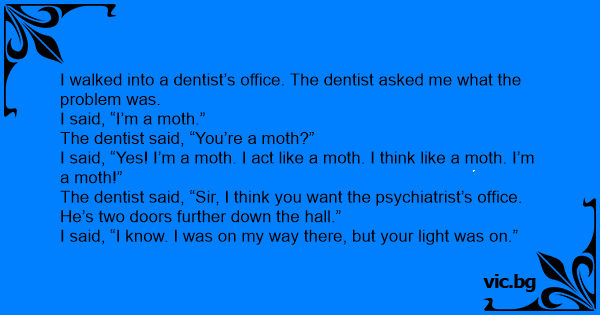 The dentist said, “Sir, I think you want the psychiatrist’s office. He’s two doors further down the hall.”