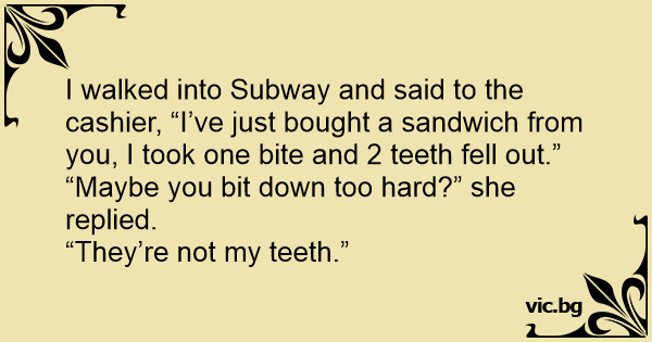 I walked into Subway and said to the cashier, “I’ve just bought a sandwich from you, I took one bite and 2 teeth fell out.”