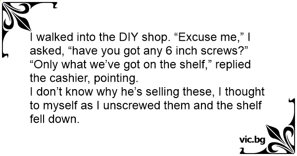 I walked into the DIY shop. “Excuse me,” I asked, “have you got any 6 inch screws?”
