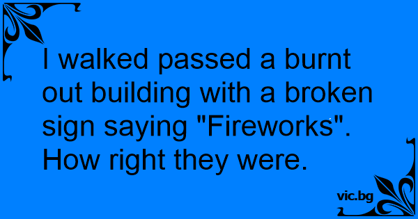 I walked passed a burnt out building with a broken sign saying "Fireworks".