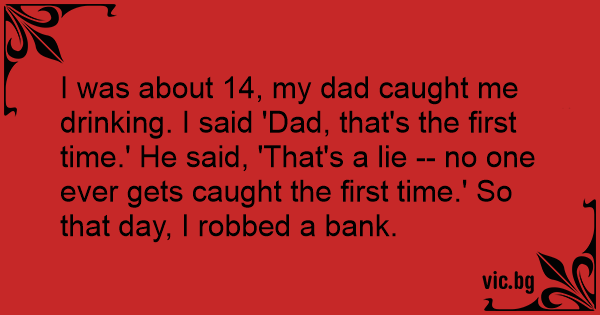 I was about 14, my dad caught me drinking. I said 'Dad, that's the first time.' He said, 'That's a lie -- no one ever gets caught the first time.' So that day, I robbed a bank.