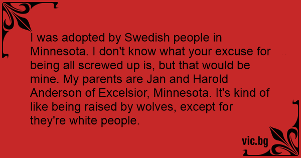 I was adopted by Swedish people in Minnesota. I don't know what your excuse for being all sсrеwеd up is, but that would be mine. My parents are Jan and Harold Anderson of Excelsior, Minnesota. It's kind of like being raised by wolves, except for they're white people.