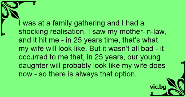 I was at a family gathering and I had a shocking realisation. I saw my mother-in-law, and it hit me - in 25 years time, that’s what my wife will look like. But it wasn’t all bad - it occurred to me that, in 25 years, our young daughter will probably look like my wife does now - so there is always that option.