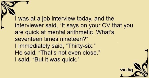 I was at a job interview today, and the interviewer said, “It says on your CV that you are quick at mental arithmetic. What’s seventeen times nineteen?”
