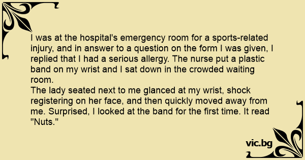 I was at the hospital's emergency room for a sports-related injury, and in answer to a question on the form I was given, I replied that I had a serious allergy. The nurse put a plastic band on my wrist and I sat down in the crowded waiting room.