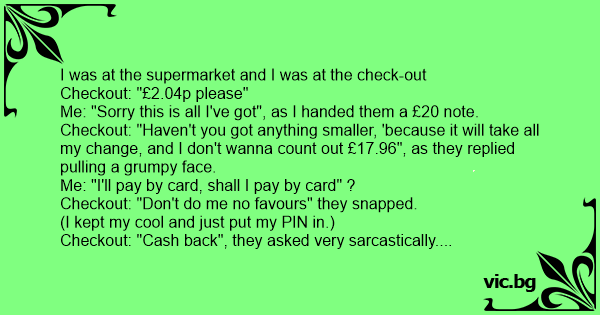 Checkout: "Haven't you got anything smaller, 'because it will take all my change, and I don't wanna count out £17.96", as they replied pulling a grumpy face.