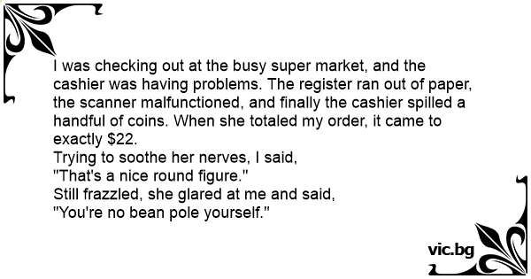 I was checking out at the busy super market, and the cashier was having problems. The register ran out of paper, the scanner malfunctioned, and finally the cashier spilled a handful of coins. When she totaled my order, it came to exactly $22.