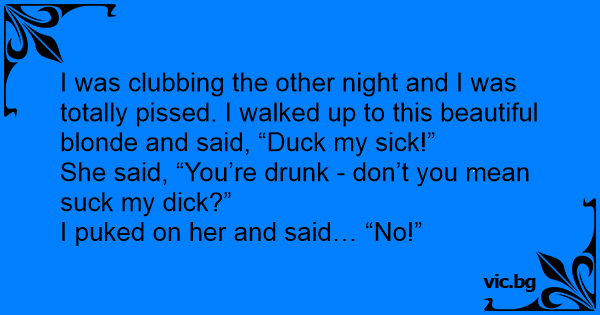 I was clubbing the other night and I was totally рissеd. I walked up to this beautiful blonde and said, “Duck my sick!”