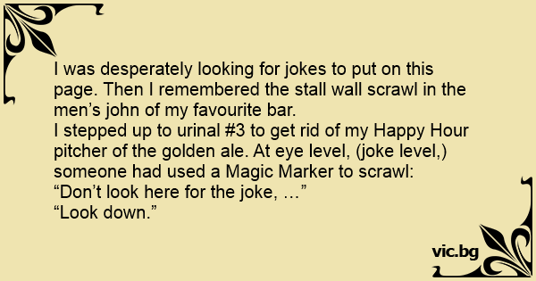 I stepped up to urinаl #3 to get rid of my Happy Hour pitcher of the golden ale. At eye level, (joke level,) someone had used a Magic Marker to scrawl: