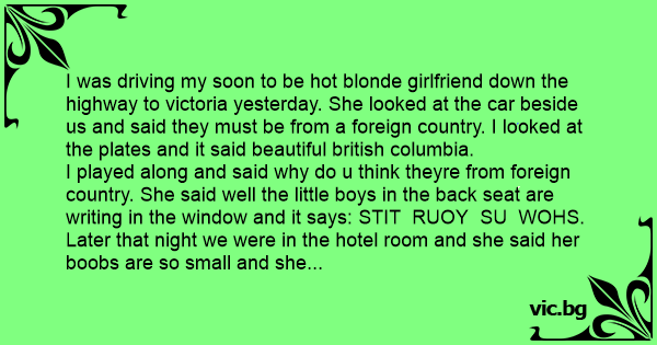 I was driving my soon to be hot blonde girlfriend down the highway to victoria yesterday. She looked at the car beside us and said they must be from a foreign country. I looked at the plates and it said beautiful british columbia.