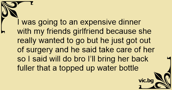 I was going to an expensive dinner with my friends girlfriend because she really wanted to go but he just got out of surgery and he said take care of her so I said will do bro I’ll bring her back fuller that a topped up water bottle