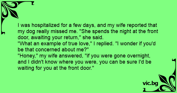 I was hospitalized for a few days, and my wife reported that my dog really missed me. "She spends the night at the front door, awaiting your return," she said.