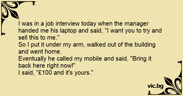 I was in a job interview today when the manager handed me his laptop and said, “I want you to try and sell this to me.” So I put it under my arm, walked out of the building and went home....
