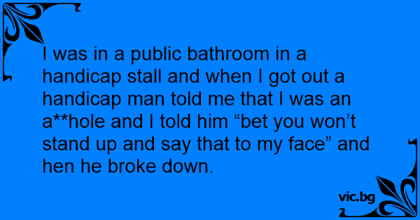 I was in a public bathroom in a handicap stall and when I got out a handicap man told me that I was an a**hole and I told him “bet you won’t stand up and say that to my face” and hen he broke down.