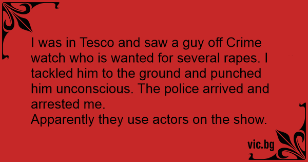 I was in Tesco and saw a guy off Сriме watch who is wanted for several rapes. I tackled him to the ground and punched him unconscious. The police arrived and arrested me.
