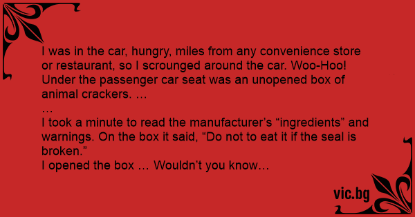 I was in the car, hungry, miles from any convenience store or restaurant, so I scrounged around the car. Woo-Hoo! Under the passenger car seat was an unopened box of animal crackers. …