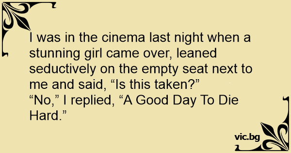 I was in the cinema last night when a stunning girl came over, leaned seductively on the empty seat next to me and said, “Is this taken?”