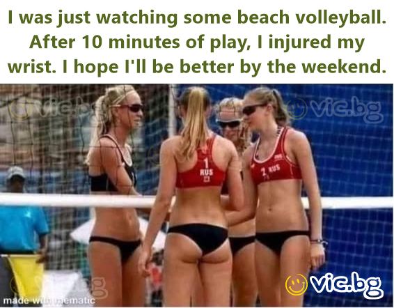 Току-що гледах плажен волейбол. След 10 минути игра си контузих китката. Надявам се да се оправя до уикенда.