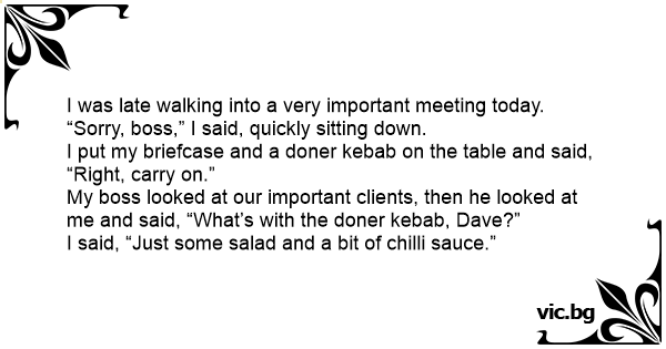 My boss looked at our important clients, then he looked at me and said, “What’s with the doner kebab, Dave?”