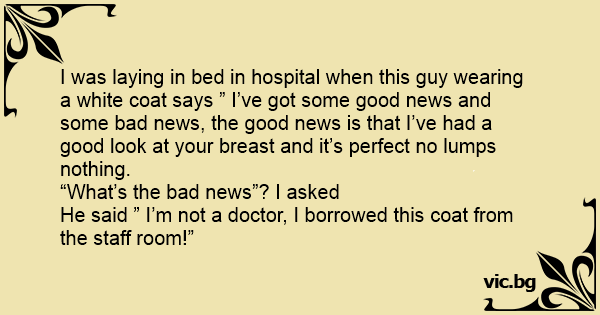 I was laying in bed in hospital when this guy wearing a white coat says ” I’ve got some good news and some bad news, the good news is that I’ve had a good look at your вrеаsт and it’s perfect no lumps nothing.