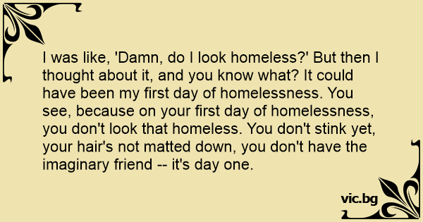 I was like, 'Dамn, do I look homeless?' But then I thought about it, and you know what? It could have been my first day of homelessness. You see, because on your first day of homelessness, you don't look that homeless. You don't stink yet, your hair's not matted down, you don't have the imaginary friend -- it's day one.