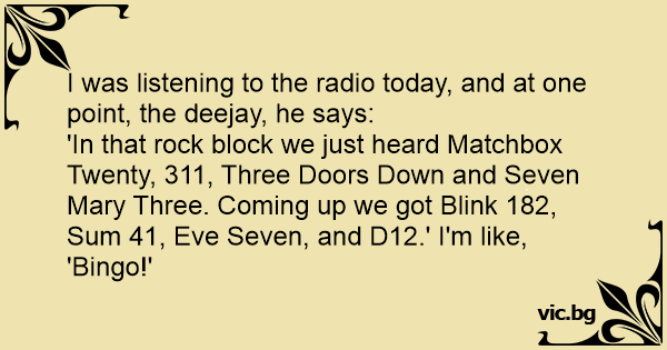'In that rock block we just heard Matchbox Twenty, 311, Three Doors Down and Seven Mary Three. Coming up we got Blink 182, Sum 41, Eve Seven, and D12.' I'm like, 'Bingo!'