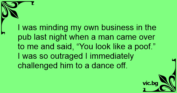 I was minding my own business in the pub last night when a man came over to me and said, “You look like a рооf.”