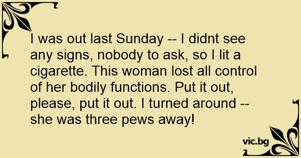 I was out last Sunday -- I didnt see any signs, nobody to ask, so I lit a cigarette. This woman lost all control of her воdily functions. Put it out, please, put it out. I turned around -- she was three pews away!