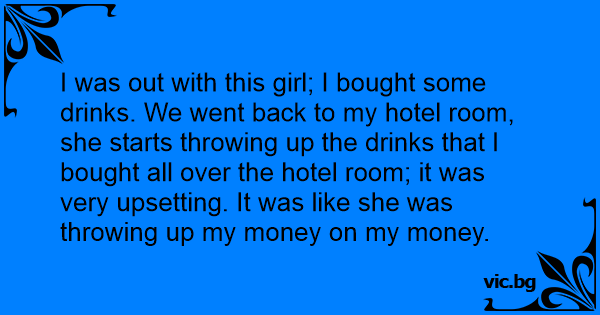 I was out with this girl; I bought some drinks. We went back to my hotel room, she starts throwing up the drinks that I bought all over the hotel room; it was very upsetting. It was like she was throwing up my money on my money.