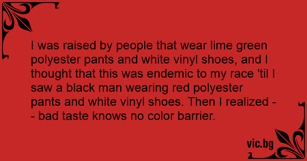 I was raised by people that wear lime green polyester pants and white vinyl shoes, and I thought that this was endemic to my race 'til I saw a black man wearing red polyester pants and white vinyl shoes. Then I realized -- bad taste knows no color barrier.