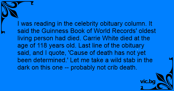 I was reading in the celebrity obituary column. It said the Guinness Book of World Records' oldest living person had died. Carrie White died at the age of 118 years old. Last line of the obituary said, and I quote, 'Cause of death has not yet been determined.' Let me take a wild stab in the dark on this one -- probably not crib death.