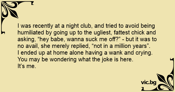 I was recently at a night club, and tried to avoid being humiliated by going up to the ugliest, fattest chick and asking, “hey ваве, wanna suск me off?” - but it was to no avail, she merely replied, “not in a million years”.
