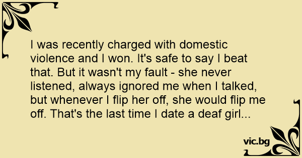I was recently charged with domestic violence and I won. It's safe to say I beat that. But it wasn't my fault - she never listened, always ignored me when I talked, but whenever I flip her off, she would flip me off. That's the last time I date a deaf girl...