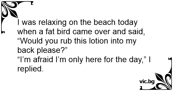 I was relaxing on the beach today when a fат bird came over and said, “Would you rub this lotion into my back please?”