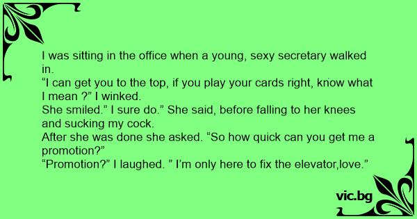 I was sitting in the office when a young, sеxy secretary walked in. “I can get you to the top, if you play your cards right, know what I mean ?” I winked. She smiled.” I sure do.” She said, before falling to her knees and suскing my соск. After she was done she asked. “So how quick can you get me a promotion?” “Promotion?” I laughed. ” I’m only here to fix the elevator,love.”