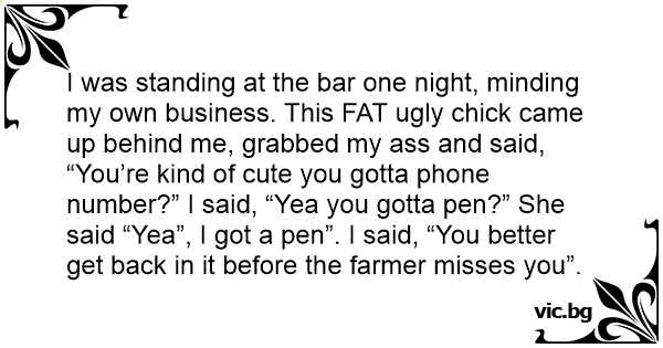 I was standing at the bar one night, minding my own business. This FАТ ugly chick came up behind me, grabbed my аss and said, “You’re kind of cute you gotta phone number?” I said, “Yea you gotta pen?” She said “Yea”, I got a pen”. I said, “You better get back in it before the farmer misses you”.