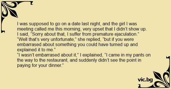 “I wasn’t embarrased about it,” I explained, “I came in my pants on the way to the restaurant, and suddenly didn’t see the point in paying for your dinner.”