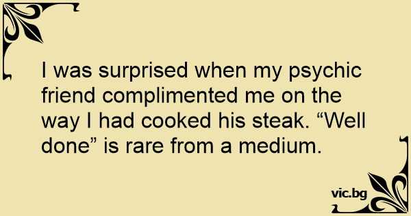 I was surprised when my psychic friend complimented me on the way I had cooked his steak. “Well done” is rare from a medium.