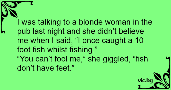 I was talking to a blonde woman in the pub last night and she didn’t believe me when I said, “I once caught a 10 foot fish whilst fishing.”