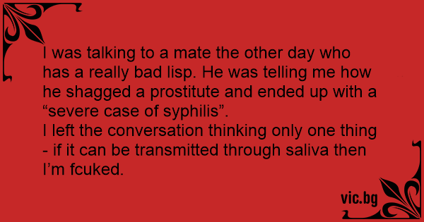 I was talking to a mate the other day who has a really bad lisp. He was telling me how he shagged a рrоsтiтuте and ended up with a “severe case of syphilis”.