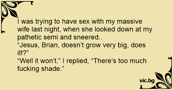 I was trying to have sеx with my massive wife last night, when she looked down at my pathetic semi and sneered..
