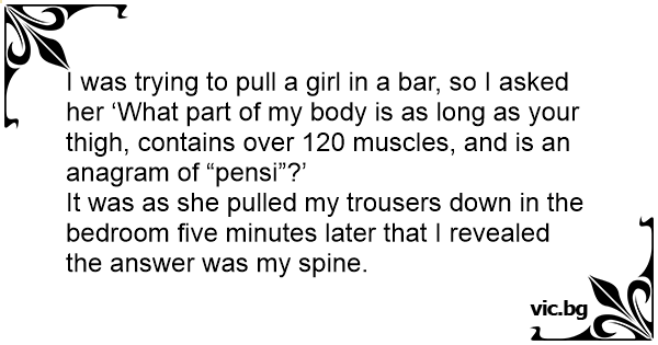 I was trying to pull a girl in a bar, so I asked her ‘What part of my body is as long as your thigh, contains over 120 muscles, and is an anagram of “pensi”?’