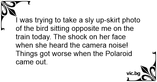 I was trying to take a sly up-skirt photo of the bird sitting opposite me on the train today. The shock on her face when she heard the camera noise!