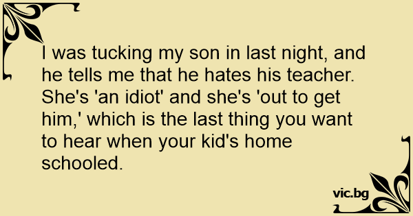 I was tucking my son in last night, and he tells me that he hates his teacher. She's 'an idiот' and she's 'out to get him,' which is the last thing you want to hear when your kid's home schooled.