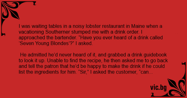 I was waiting tables in a noisy lobster restaurant in Maine when a vacationing Southerner stumped me with a drink order. I approached the bartender. “Have you ever heard of a drink called ‘Seven Young Blondes’?” I asked.